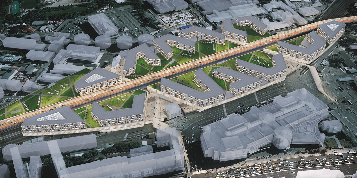 Pedestrian paths in the shape of the Russian Railways logo crisscross the area. Nizhniy Susalniy Lane is to be extended through a tunnel beneath the railroad tracks and linked to the existing intra-block passages leading to Kurskiy Rail Terminal Square and Puteyskiy Blind Alley.